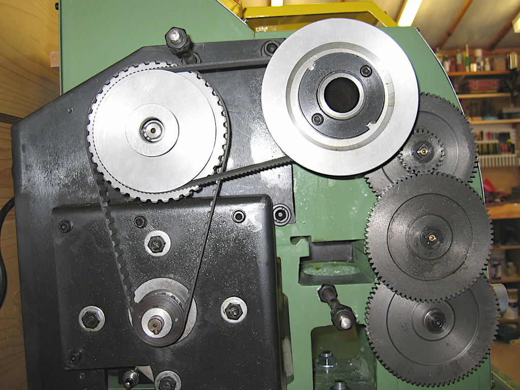 The headstock (1) is basically a box shaped casting that is bolted onto the bed and carries the spindle set in tapered roller bearings. The spindle has an integral backplate which has a 52mm register for mounting the work-holding device. A minor criticism is that the backplate is only about 15mm from the headstock, which can make chuck mounting a little awkward. If you have large fingers trying to hold the chuck in place whilst putting nuts and washers on the three studs can be a bit of a challenge. The studs supplied with the chucks tend to be a little long, not to mention different lengths. I discarded the original nuts and washers and used flanged nuts instead, this makes attaching a chuck slightly easier. I couldn't find smooth faced flange nuts so I made a small threaded mandrel and turned the serrations off to make nice smooth backs. The spindle rotates smoothly with no appreciable runout. Removing the front plate from the headstock reveals very little, apart from the wiring to the display and speed control and the disc with it′s sensor for rpm reading.