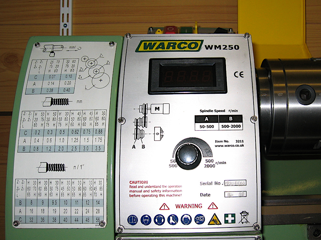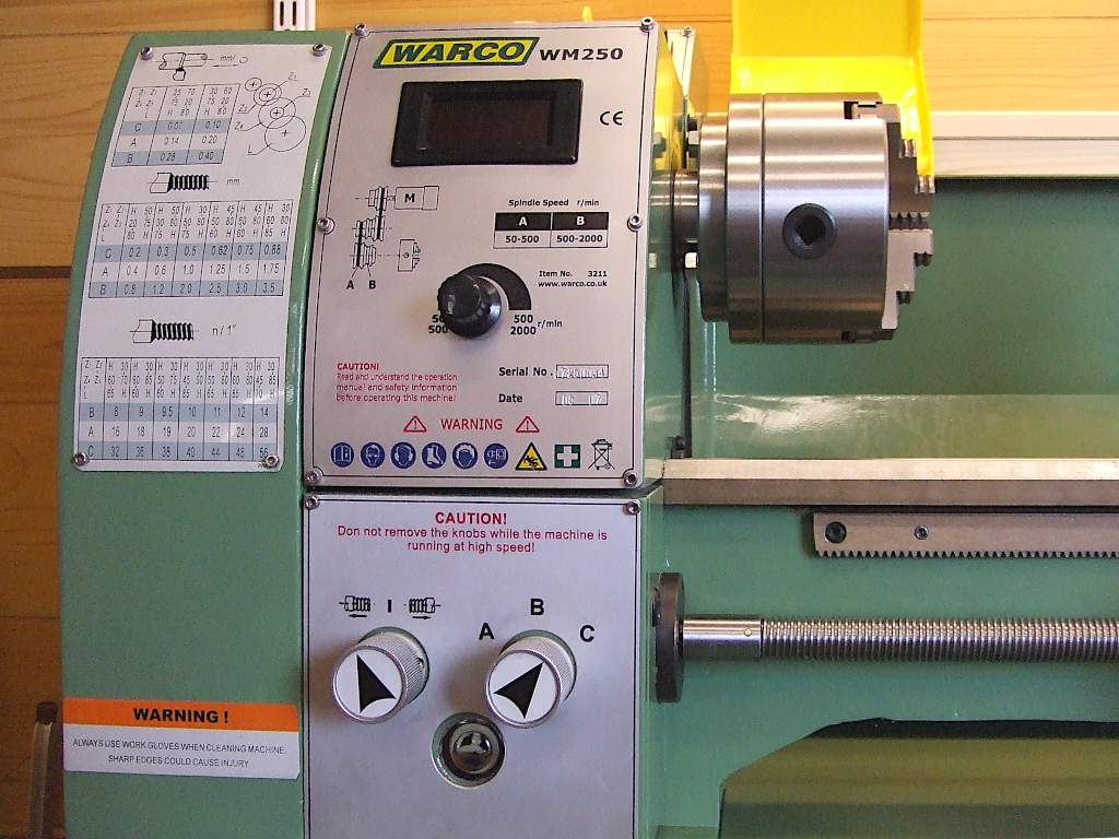 The image above shows the latest model from the Warco catalogue, it has a few minor differences from my 2007 vintage lathe. Leadscrew covers, lever operated tailstock, emergency stop button and a slightly different speed display.