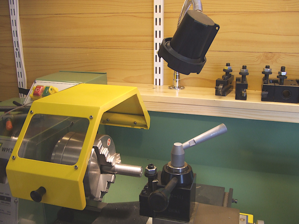 The lathe comes as standard with a three jaw chuck, a four jaw chuck, faceplate, traveling and fixed steadies, two dead centres, four-way toolpost, swarf tray and rear splash guard. Also provided is a toolbox with assorted spanners, allen keys, chuck keys, toolpost key and the change gears that are not fitted.