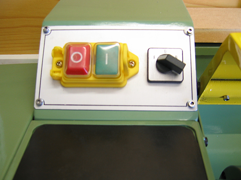 To the rear of the headstock a sheet metal cabinet contains the electrics, motor and starter panel (3). The starter panel has a NVR stop-start button and a forward-off-reverse switch. There is normally a spring loaded cover with a red stop-lock button over the NVR but I have removed this as I find it annoying having to keep moving it out of the way to use the start button. You need to use the start-stop buttons all the time as there is no clutch on this lathe and the variable speed does not drop to zero rpm. The black lever switch on the right is forward - off - reverse, useful for screw cutting but it should be noted that the motor does not run at full speed in reverse. The main electronic speed control board is situated just below the buttons fixed to the rear of cabinet. The DC motor is at the base of this cabinet and does not get much ventilation, after prolonged use the motor and the speed control board above it have made the lathe quite warm.