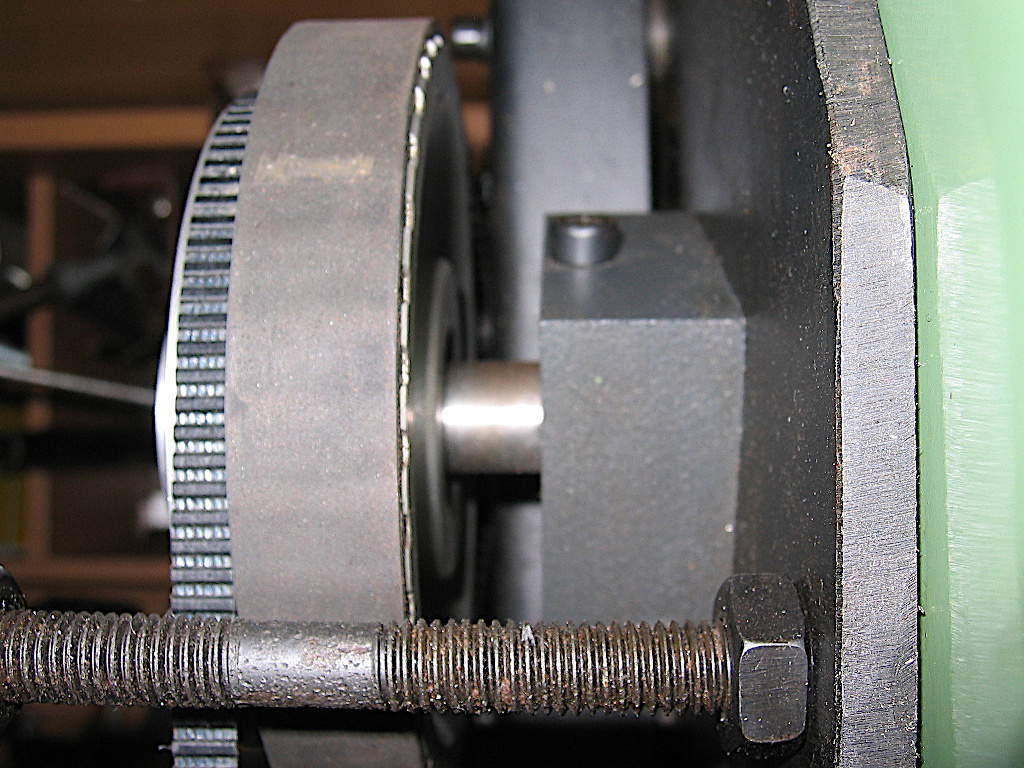 The belts and change gears can be seen (4) this is slightly different from earlier models where there was no intermediate pulley. The primary drive is via a toothed belt and the tension on this can be adjusted by loosening the four motor fixing bolts and sliding the motor up or down. The secondary belt is an ordinary V-belt and is tensioned by sliding the pulley assembly left or right. The manual forgets to mention how to release it, (5) two spanner flats on the spindle which unscrew it from a captive t-nut in a slot. Very difficult to see as everything is painted matt black and in the shadows. There is an allen headed bolt which pulls the spindle to the left to apply tension to the belt (see Belt Tension Adjuster). The black disc at the centre of the spindle pulley takes a c-spanner to adjust the bearing preload.