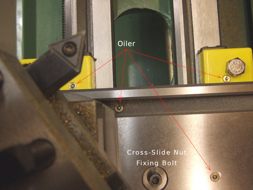 The T-slots in the top-slide mean that this can be used as a machine table in conjunction with the bolt-on milling head. It is of course useful for additional tool holding arrangements such as a rear toolpost. The locating pin for the top-slide could also be removed allowing it to be positioned anywhere on the cross-slide. This may be useful as the cross-slide movement is limited to 115mm which is less than the 125mm which it needs to be for maximum facing capacity. Photo (8) shows another slight shortcoming, the cap head screw that retains the cross-feed nut is proud of the surface, as is the oiler, which means that the table surface is not flat if you want to use it for milling. The oiler for the dovetail slide is also cunningly hidden at the bottom of the T-slot just where all the swarf collects and is difficult to clean out due to the clamp plate above. The BZP hex headed bolt on the right I have added to prevent the threaded hole for mounting the traveling steady filling with swarf.