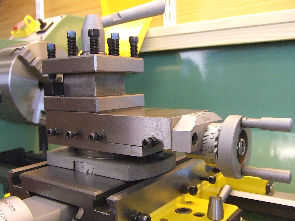 The top-slide is mounted to the cross-slide by means of a substantial clamping plate. (7) A close look at the photo shows that the plate has flexed in the centre where the cutout for the angle scale has been machined. This clamping plate has been widely reported as a source of vibration in the 9x20 series of lathes to which the WM250 would appear to be related. I cannot say I have encountered any such problem thus far but the clamping bolts are a bit of a pain, being hidden in a relatively small gap beneath the top-slide. I have seen an article in Engineering in Miniature (Tee Publications) describing a fix for this. The lathe is supplied with a four way toolpost as standard, originally fitted with a hefty detent spring which I removed. I feel a quick change toolpost coming on! (See Quick Change Toolpost which covers both a new cross-slide toolpost and fitting a QCTP).