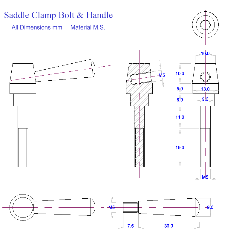 The next job is to make the clamping screw and lever, this is fairly straightforward turning and the drawing (5) I hope is self explanatory (Click on the image for a readable version). The original article shows the clamping screw with a head similar to mine but with a large washer under it bearing on the top of the saddle. I didn′t like this as it overhung the edge of the saddle somewhat. I made mine similar in shape to a cap screw with the head added on top, this means that screw tightens in the original counterbore rather than on the top of the saddle which saves the paint. There is a space between the head of the clamping screw and the top of the saddle and it may be worthwhile checking the depth of the counterbore to ensure that this happens. Photo (6) shows the clamp screw, handle and the spacing collar to reduce the M8 counterbore to M5 (Note there is no drawing for the spacer, just measure and make to fit). If you do not want to make the handle a ready made bristol lever could probably be found to suit.