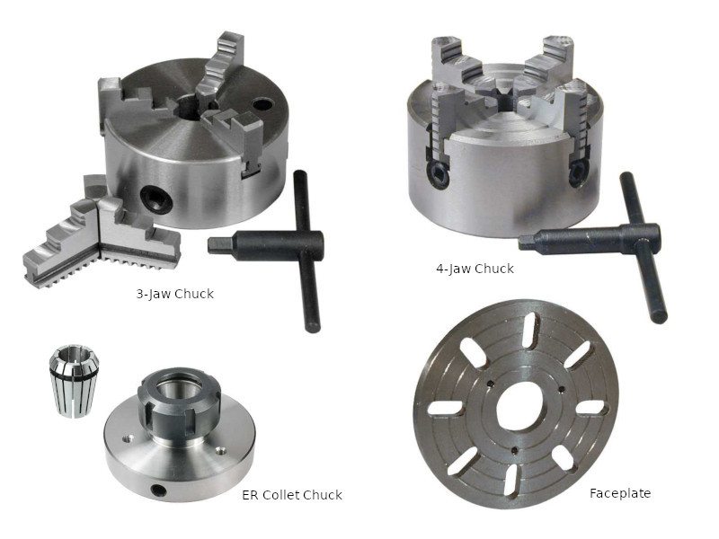Image (18) shows various lathe chucks for Sieg machines from Arceurotrade, you will however need a chuck to suit your own lathe. You will probably have received at least a 3-jaw chuck with a new machine but fitting a new chuck is not too difficult. You may be able to buy a chuck ready to fit or you may have to machine a backplate that fits between the spindle nose and the chuck. There are three basic types of chuck, self centring, independent jaw and collet. The self centring 3-jaw chuck is most common it should come with two sets of jaws an internal set and an external set. Be aware that each jaw only fits in one location on the chuck, the slots and jaws should be numbered. Self centring chucks also come in 4-jaw and 6-jaw varieties although the 6-jaw is fairly rare and usually expensive. Another chuck commonly supplied with a new lathe is the 4-jaw independent chuck. Each jaw on this type of chuck can be adjusted individually, this means that the chuck can be used to hold square, rectangular and odd shapes such as castings. It is also possible to centre round bars very accurately in the 4-jaw chuck. A normal 3-jaw chuck will only be accurate to within about 0.1mm (0.004") unless you have a "Griptru" chuck where the runout can be adjusted from the backplate.