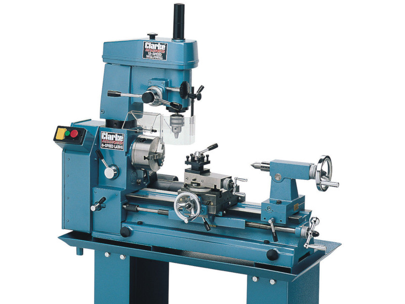 Last at (17) is one of the combination lathe / milling machines. This one from Clarke is the CL500M with 305mm swing and 430mm between centres with a milling capacity of 300mm over the table (cross-slide). The machine has a footprint of 1100mm x 600mm x 880mm (LxDxH) so might be what you need if pushed for space. I have never owned or used one of these machines so can give no first hand guidance but I have read that the milling capabilities are somewhat limited by lack of rigidity.You can see from the picture that what would be the column in a milling machine basically has a large hole through it to take the lathe spindle. You can also see that on this particular model there is no carriage handwheel, you have to wind the carriage left to right using the lead-screw handwheel. Another thing to be aware of is the height of the machine, with the lathe bed at a normal height the top of the mill head is a long way up. If you set the machine on a lower bench you may end up stooping somewhat to operate the lathe. There are bigger versions of this type of machine for example the Chester Centurion 3 in 1 machine which although with a similar footprint has a 420mm swing with 500mm between centres.