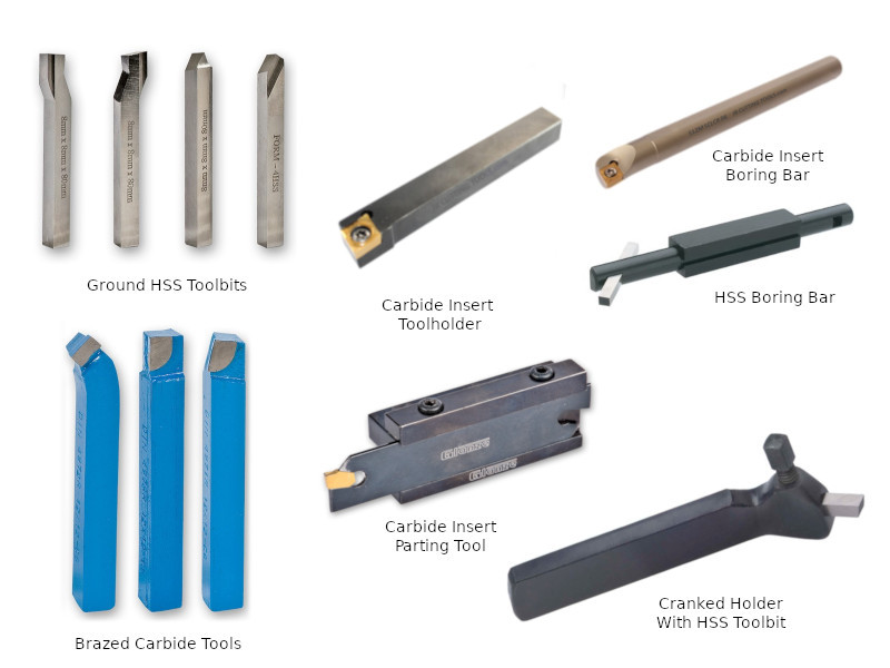 To do any work on the lathe you will need some cutting tools. You are unlikely to receive anything useful with a new lathe but a used machine might have something useable. I would steer clear of sets of cutting tools you may get a couple of useful ones but the rest will be little used, ask me how I know this. If you can, buy good quality tools, Sumitomo, Korloy, Sandvik Coromant perhaps. Top left of image (19) are some pre-ground HSS toolbits probably a good place to start if you have never done any turning before. HSS (high speed steel) is an alloy containing iron and commonly chromium, vanadium, silicon and molybdenum among other elements. Specific alloys have different properties but all are tougher and retain a cutting edge at higher temperatures than plain carbon steel. The best way to use HSS is to purchase tool blanks usually square or round 50mm to 80mm long at a size to suit the lathe, 9mm (⅜") is a common size. Grinding the cutting edge to shape is a reasonably straightforward task using a standard bench grinder, have a look at this Tool Grinding Video if you want make your own HSS toolbits. The group of 3 brazed carbide tip tools, bottom left (19), are not as common as they used to be but you may be "given" a set with a new lathe. Unfortunately they are likely to be of poor quality, cut poorly and chip easily. There are better quality brazed tip tools about but these are often supplied unsharpened and you will need a green grit or diamond wheel for your grinder to make them useable. I think the general advice might be to avoid.